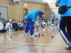 ペタンク(フランス発祥の球技)は、コート上に描いたサークルを基点として、木製のビュット(目標球)に金属製のボールを投げあって、相手より近づけることで得点を競う静かな優雅なスポーツです。本来は屋外競技ですが、屋内でも楽しめるように、鉄球の代わりに錘入りゴム製のボールを使って楽しみます。それに「上飯田団地方式」を採り入れ、誰でもが参加できるように工夫したわけです。
