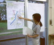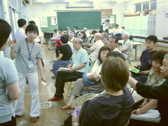 このような成果と課題を見直し、再度団地の現況を話し合い、今後に結び付けようとの集いが今回の目的。土曜日の夕刻の時間にもかかわらず、当地区社協高野会長、宮崎当地区連合自治会会長をはじめ、各役職者ならびにボランティア関係者、それに泉区役所いちょう団地地域支援チーム祐田リーダー他7人のスタッフなど、総勢40名近くが集まり、活発な意見交換が行われた。 高野会長から「いちょう団地の目指す町」について、基本的な指針が話された後、団地マップを基に、出された具体的な意見を模造紙に列記。「空き部屋の利用は出来ないか」「団地内を移動するのに、バスの乗換えが必要」「川にもう一本橋があれば・・」「高齢者夫婦のうち、男性の引篭りが目立ち、将来を考えると不安が多い」など、実生活に係わる意見が続出。一方では、「高齢男性を、サロンなどの集まりに誘おう」「声かけをどんどん続けよう」「自治会ごとに高齢化率も違う。もっと交流の場を・・」といった前向きの声も多かった。前日の22日(金)には、多文化事業への取り組みも協議され、外国籍住民との交流についても、前向きな活動計画が自治会ごとに述べられていた。