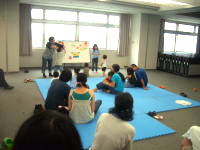 その代表的プログラムの「Stop Drop and Roll」(自分の服に火が付いたら、止まって、床に伏せて、転がり、酸素供給をなくし、窒息消火)、「Great Escape」(火事で煙が充満してきたら、煙は軽いので上にあがり、床面近くには来ないので、身を低くし這って進む。ドアーをチェックして熱ければ、別ルートで。シーツでドア下の隙間をシールしたり、窓から外に向かって白布を振ったり、連続音で合図を送るなど)、「Learn not to Burn」、「Risk Watch」 について詳しく紹介。これらは、例えば火への恐れは大事だが、それを乗り越えるための知恵を教え、子どもの命の危機管理能力向上を目指している、としていた。 また、米国では消防署の70%がボランティア消防士。最近ニューヨークでの経験として、Youth Firefighter Programで自主的に訓練を受けている13〜17歳の若者と話し機会があった。彼らが地域に貢献でき嬉しい、また誇りだと語ってくれ、ボランティアのあり方を感じたとしていた。 そして、この養成講座の受講者たちは、若い子育て中の方たちが多いが、子どもたちのために学ぶことは、家族の安全レベルを上げるだけでなく、地域の安全水準のレベルアップに貢献するもの。今回の受講で得たものを、ぜひ周りの人たちに拡げて行ってほしい、と語りかけていた。 昨年の同養成講座受講者で結成した「ピタゴロゴロン」一座の「Stop Drop and Roll]、[Great Escape」の実演が披露され、今回受講者の参加を呼び掛けていた。